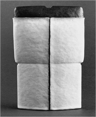 Helles Steinzeug, aufgebaut aus Platten, akzentuiert durch betont herausgearbeitete, kontrastfarbig glasierte Linien, 1215 °C, schwarz-weiß glasiert