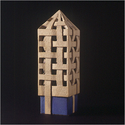 Helles schamottiertes Steinzeug, in Streifen geflochten und auf Sockel montiert, Inhalt separat gebrannt, dann von unten eingefügt; 1215 °C, Sockel blau glasiert, sonst unglasiert