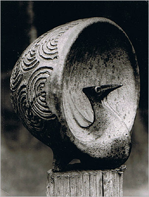 Schwarzes Steinzeug, doppelwandig gedrehtes Rad, Kopf frei modelliert, an der Außenseite des Rades ornamental eingetiefte Pfauenfedern, 1215 °C, grüne Feldspatglasur