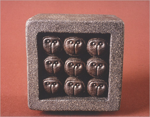 Schwarzes Steinzeug, aus Platten zusammengefügt, Eulen aus Modeln gewonnen, montiert, 1215 °C, unglasiert