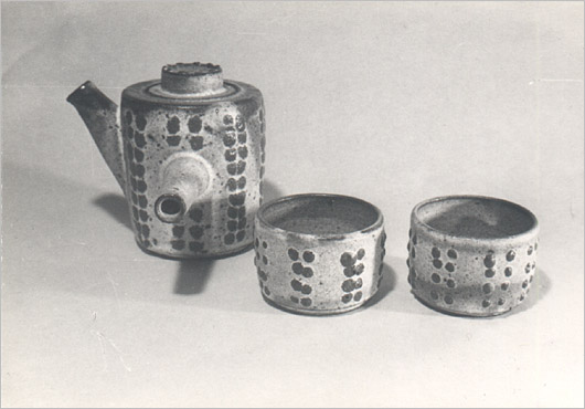 Schwarzes Steinzeug, gedreht, kleiner Deckel, 1215 °C, weiße Feldspatglasur mit Muster aus blauen Tupfen