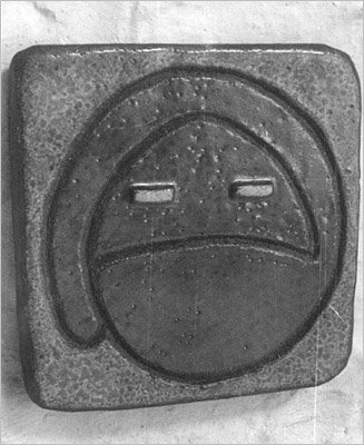 Schwarzes Steinzeug, Umriss eingetieft, Augen anmodelliert, 1215 °C, grün-gelbe Feldspatglasur;
