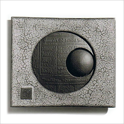 Schwarzes Steinzeug, Rahmen glasiert, rundes Innenleben, spiegelverkehrt mit Matern bedruckt, vertieft eingelassen, darin eingelassen glatt modellierter Mond, Innenleben unglasiert, 1215 °C