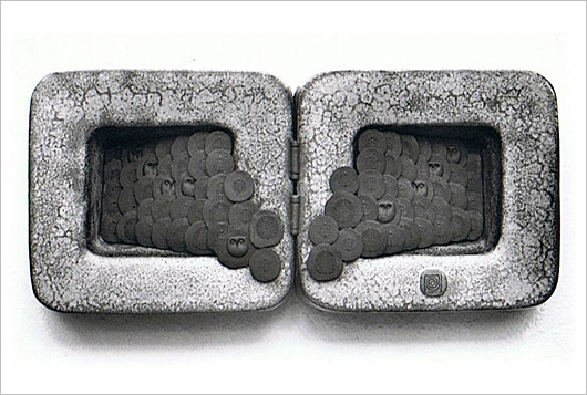 Schwarzes Steinzeug, Bildstock in Negativform gedrückt, montiert, glasiert; Innenleben aus Modeln gewonnen, montiert, nach dem Brand eingesetzt, unglasiert; 1215 °C