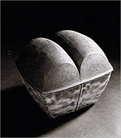 Schwarzes Steinzeug, aus Platten aufgebaut, Sockel glasiert, Buchseiten mit Matern bedruckt, unglasiert, 1215 °C