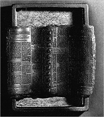Schwarzes Steinzeug, Kasten aus Platten aufgebaut, Feldspatglasur innen, Buchseiten mit Matern bedruckt, unglasiert, Stahldraht"bindung", 1215 °C