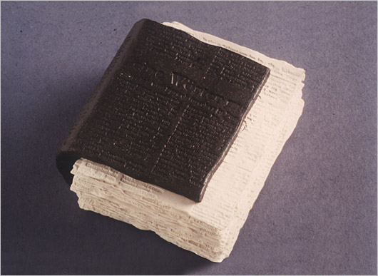 Buchblock einzelne mit Matern bedruckte Porzellanblätter, nach dem Brand eingefügt, unglasiert, 1300 °C