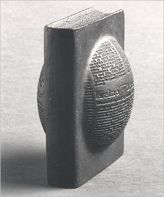 Schwarzes Steinzeug, Buchdeckel glatt, vorgewölbte Halbkugeln mit Matern bedruckt, 1215 °C, unglasiert