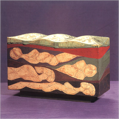 Helles Steinzeug, aus Tonplatten gebaut, unter Verwendung von Drahtnetzen gestaltet, 1215 °C, mehrfarbig engobiert, Oberfläche glasiert
