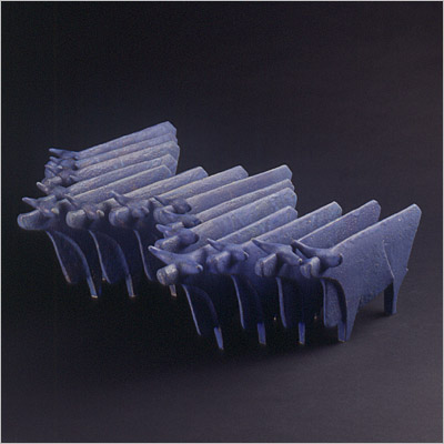 Helles schamottiertes Steinzeug, Ochsen einzeln in Negativform gedrückt und nebeneinander montiert, 1215 °C, glasiert