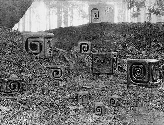Schwarzes Steinzeug, aus lederharten Tonkuben herausgeschnitten, 1200 °C, weiße, blaue und grüne Feldspatglasur