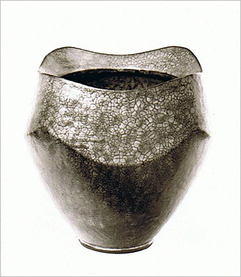 Schwarzes Steinzeug, gedreht, Zwischenteil frei modellierend eingefügt, 1215 °C, Grüne Lithiumglasur