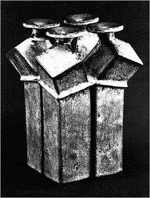 Schwarzes Steinzeug, aus Tonplatten aufgebaut, Hälse gedreht und anmodelliert, Teile in Höhe des Knicks miteinander verbunden, 1215 °C, grüne Lindenholzascheglasur