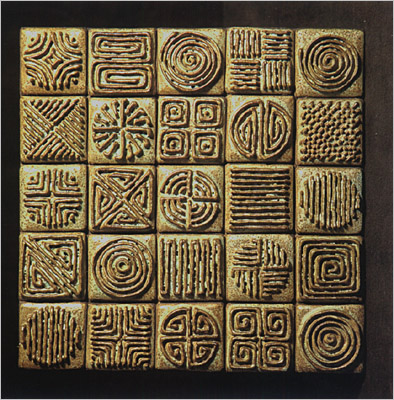 Schwarzes Steinzeug, zusammengesetzt aus 5 x 5 Quadraten, die jeweils ein anderes, in Tonschlickermalerei aufgetragenes Dekor tragen; 1215 °C, grüne Feldspatglasur