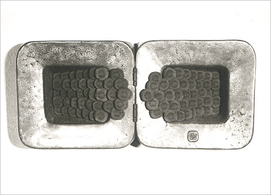 Schwarzes Steinzeug, Bildstock in Negativform gedrückt, montiert, glasiert; Innenleben aus Modeln gewonnen, montiert, nach dem Brand eingesetzt, unglasiert; 1215 °C