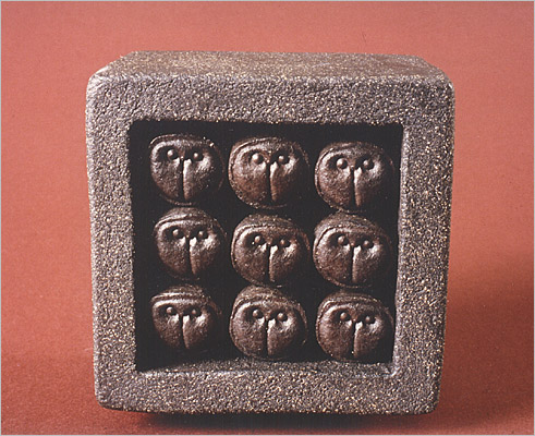 Schwarzes Steinzeug, aus Platten zusammengefügt, Eulen aus Modeln gewonnen, montiert, 1215 °C, unglasiert