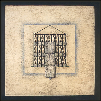 Helles Steinzeug, flaches Relief mit Einschnitten, Mitte quadratisch eingetieft, bestückt mit 21 aus Modeln gewonnenen weiblichen Torsi auf quadratischen Sockeln, 1215 °C, engobiert