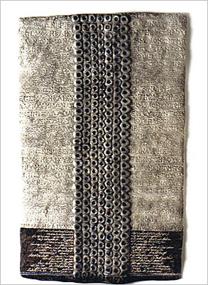 Helles Steinzeug, bedruckt, bestempelt, engobiert und dann beschrieben, 1215 °C