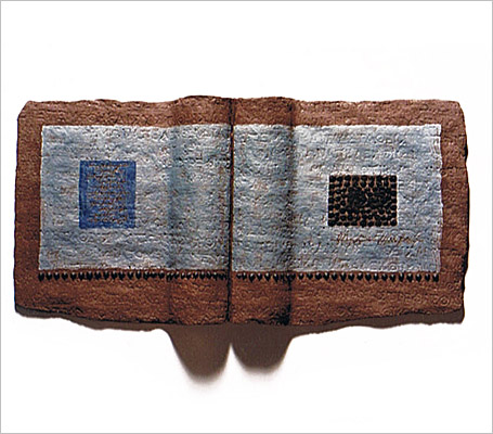 Rotbraunes Steinzeug, bedruckt, beschrieben und mit Schlickermalerei versehen, 1215 °C, engobiert