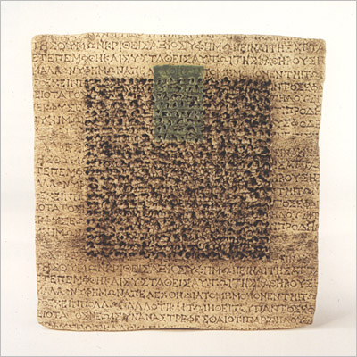 Helles Steinzeug, bedruckt, beschrieben, 1215 °C, engobiert, kleines Rechteck grün glasiert