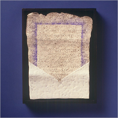 Porzellan, bedruckt, beschrieben, 1300 °C, engobiert und glasiert; montiert in einen schwarz lackierten Kasten aus Holz
