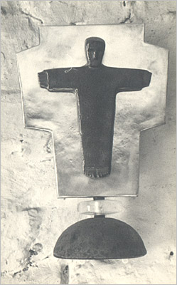 Schwarzes Steinzeug, gedrehter, glasierter, halbrunder Fuß, darüber Bergkristallring und ein Kreuz aus (vermutlich) Messing, vor dem ein flacher, glasierter Korpus hängt