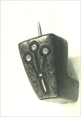 Schwarzes Steinzeug, vermutlich aus Tonplatten aufgebaut, mit dreigliedrigem Ornament bemalt und mit Kerzendorn versehen, 1215 °C, glasiert