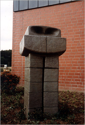 Schwarzes Steinzeug, Einzelteile aus Tonplatten aufgebaut, innen verstrebt, Fuß durch eingetiefte, unregelmäßige Rillen strukturiert, Eulengesicht frei modelliert, nach dem Brand zementiert, 1215 °C, glasiert